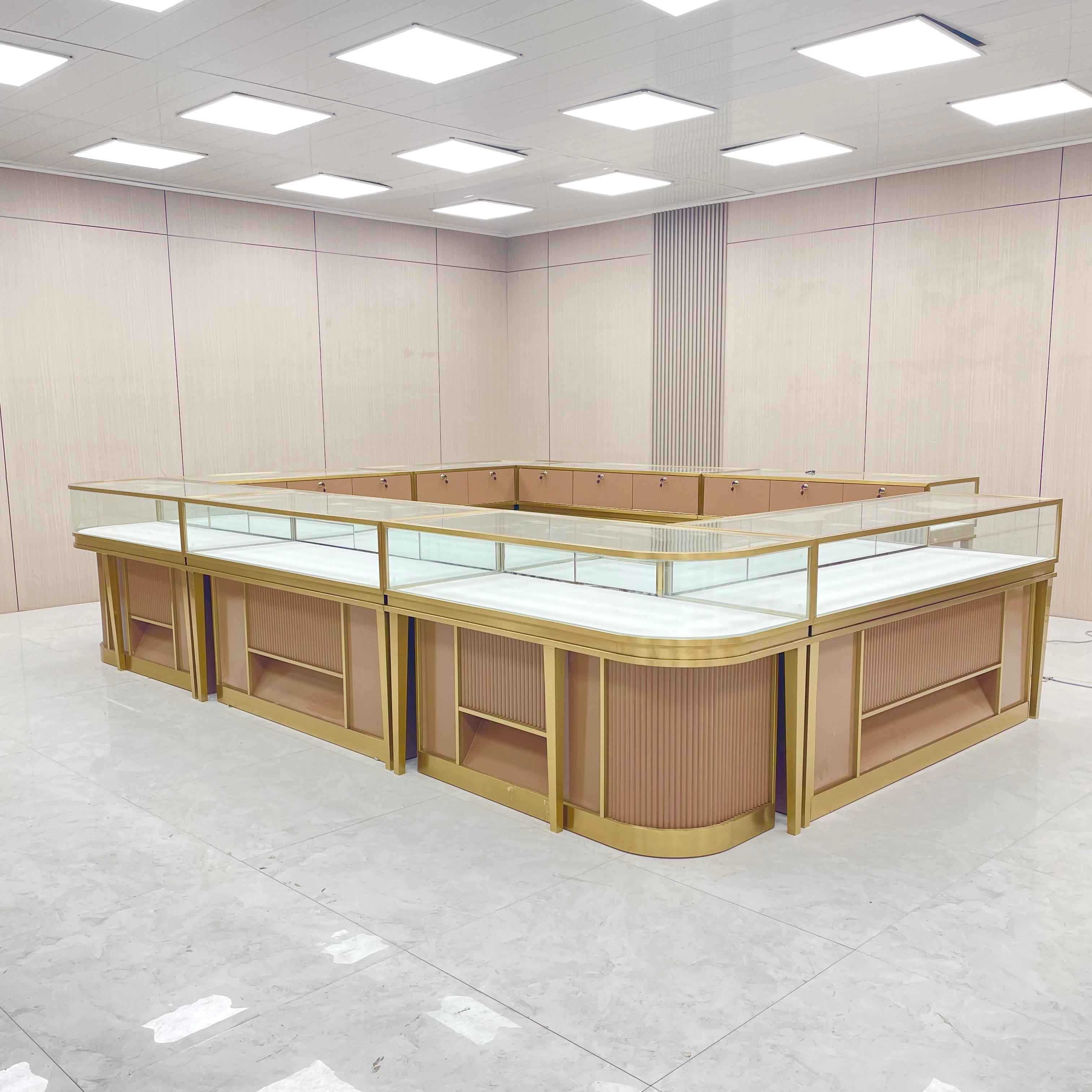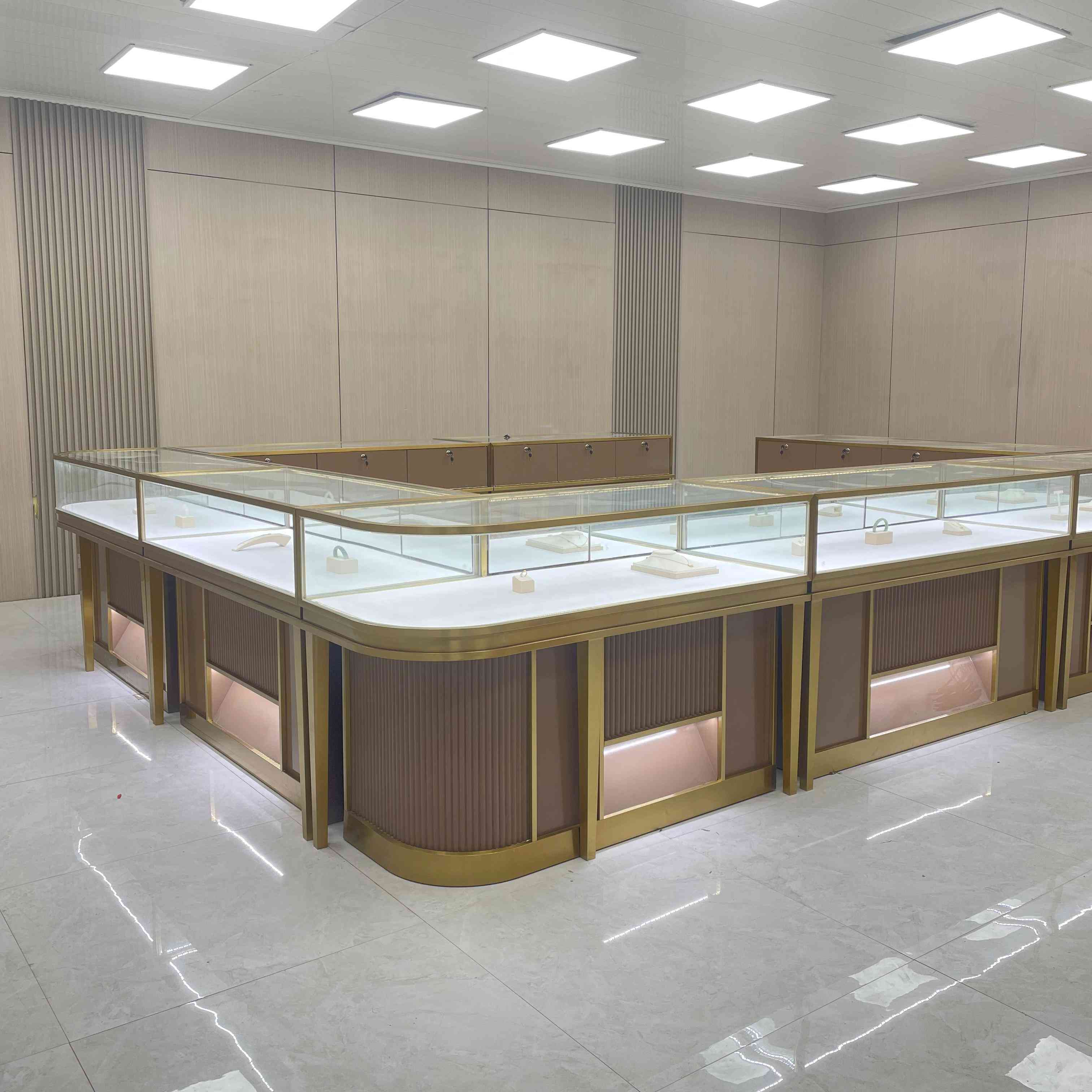 هذا هو خزانة عرض المجوهرات التجارية. يتميز بإضاءة LED لتعزيز عرض المجوهرات. يتكون الخزانة من ثماني خزائن منخفضة الارتفاع ، لكل منها أبعاد من L120*W55*H95cm ، والتي تشكل معًا تصميمًا 3M*4M للمتجر. تحتوي الخزانة على إطار من الفولاذ المقاوم للصدأ الذهبي للتيتانيوم اللامع ، مما يمنحه مظهرًا أنيقًا وفاخرًا. تصطف الداخلية بجلد بو الأبيض ، مما يوفر خلفية ناعمة ومتناقضة تبرز المجوهرات. تحد الخزانات الأساسية مع التيتانيوم الملون - الفولاذ المقاوم للصدأ الملون ، مما يضيف إلى جمالية ومتانة خزانة العرض.