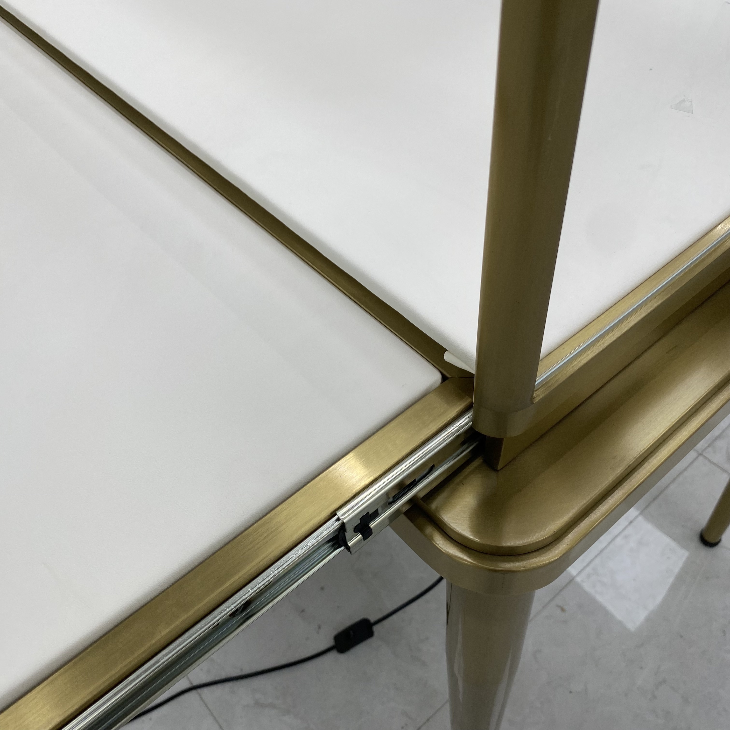تم تصميم مقدمة خزانة عرض المجوهرات على شكل مروحة لسهولة الوصول إليها ، والتي تتميز بأبواب أو أدراج تنزلق بسلاسة وصمت. هذا يسهل استرداد أو إضافة عناصر دون تعطيل الترتيب العام.