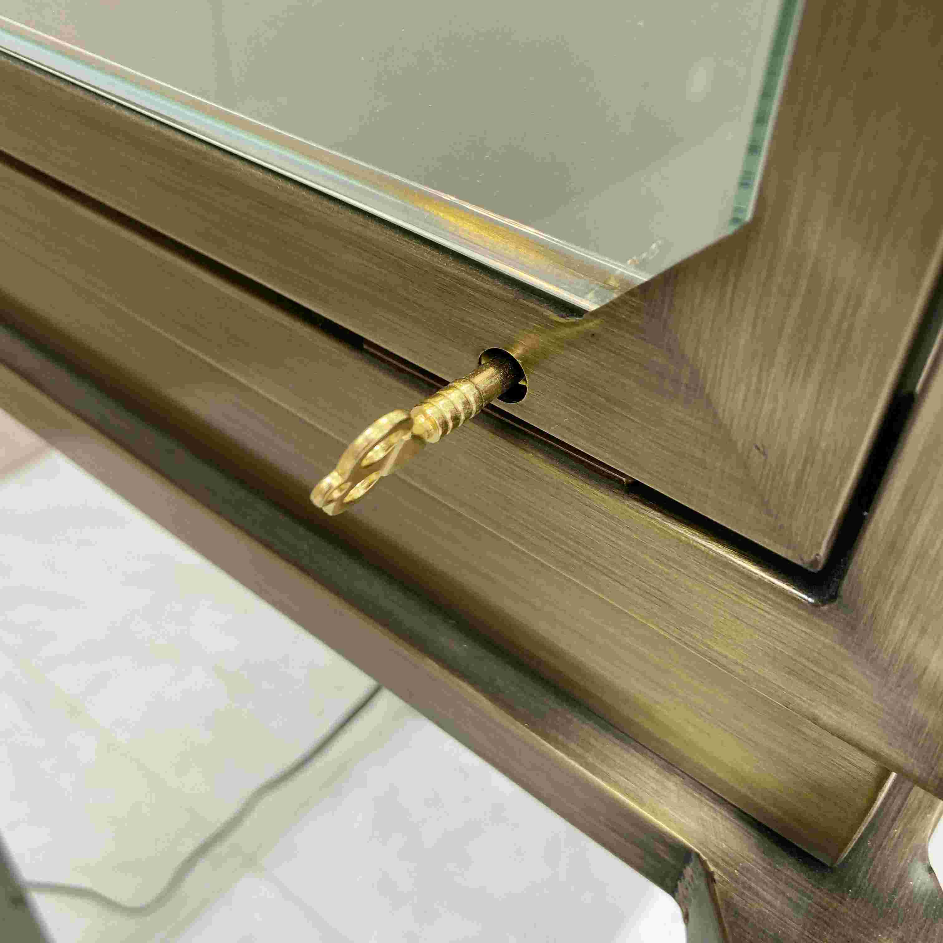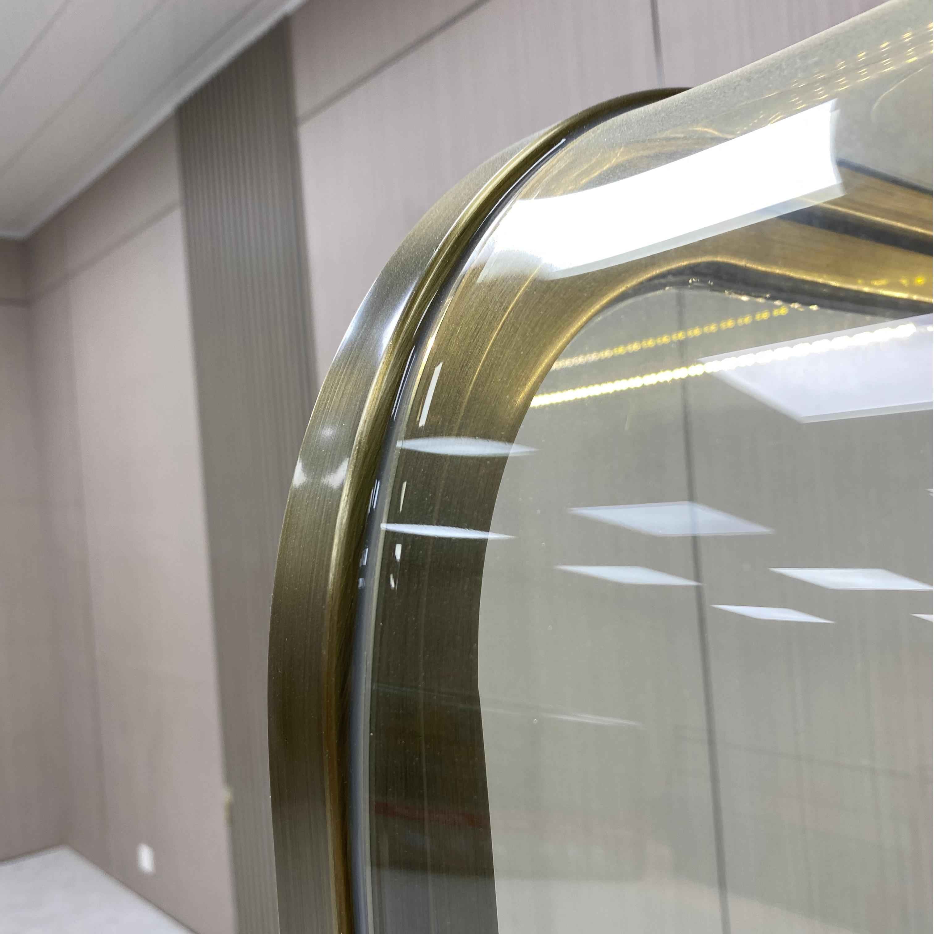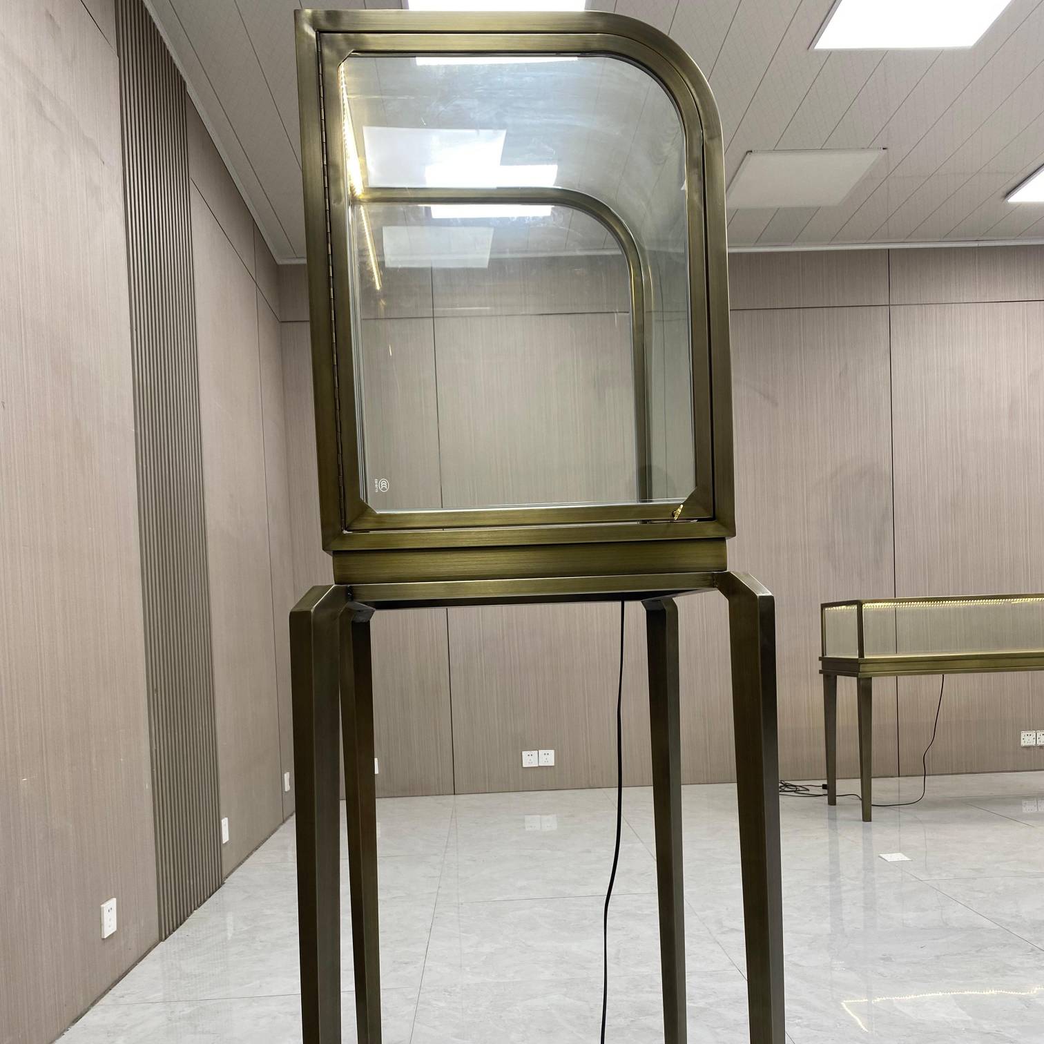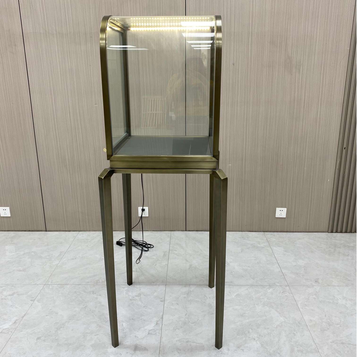 تتميز خزانة تعرض المجوهرات هذه بإضاءة LED ، والتي توفر إضاءة ممتازة لعرض المجوهرات. الحجم هو L60*W60*H160C.IT لديه تصميم على شكل قوس ، مما يمنحه مظهرًا فريدًا وأنيقًا. الخزانة مصنوعة من الفولاذ المقاوم للصدأ الملون البرونزي مع الانتهاء من الفرشاة ، مما يضيف لمسة من الرفاهية. يكمل الزجاج المنحني تصميم القوس ، مما يسمح بإطلالة واضحة وغير معلوم للعناصر الموجودة في الداخل.