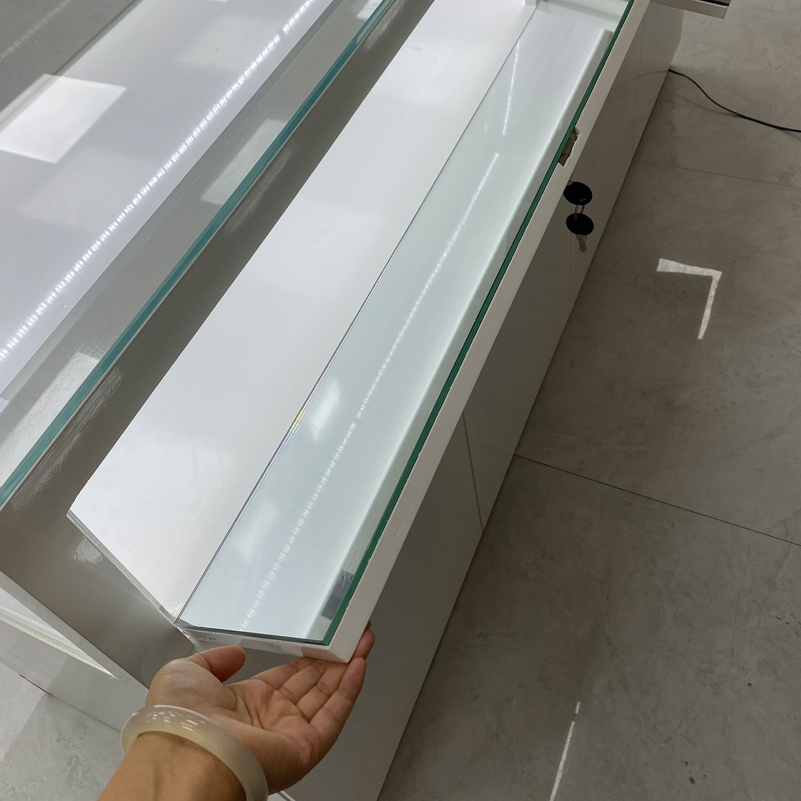 هذا هو خزانة عرض للمجوهرات مع قاعدة وردية بيضاء. الحجم هو L150*W55*H95CM.IT لديه وظيفة تخزين ، يوفر مساحة تخزين كبيرة لسعة لعناصر المجوهرات الخاصة بك. تم تجهيز الخزانة بالزجاج بلا حدود ، مما يمنحه مظهرًا عصريًا وأنيقًا .. أحد الميزات المتميزة هو أنه يتيح شعارات مخصصة ، مما يتيح لك تخصيص خزانة العرض وفقًا لعلامتك التجارية. بالإضافة إلى ذلك ، تتم تغطية الحواف مع الفولاذ المقاوم للصدأ ، مما يعزز المتانة والجاذبية الجمالية.