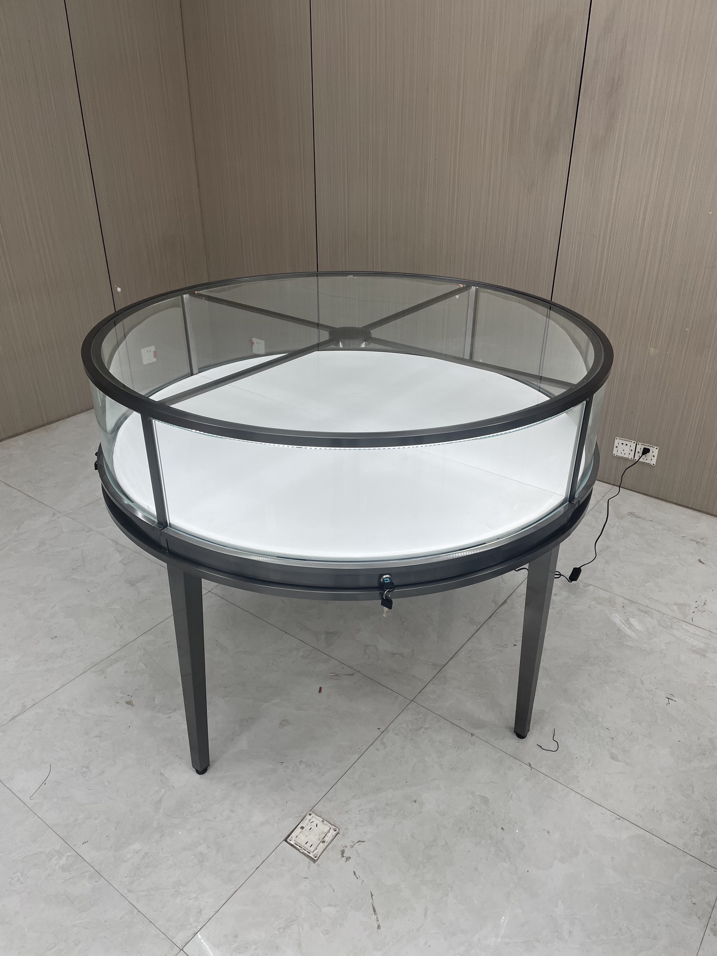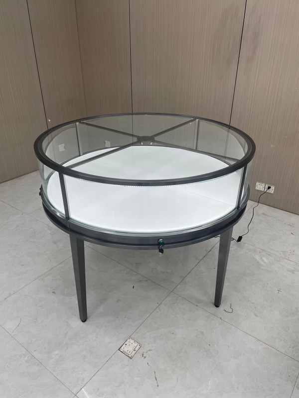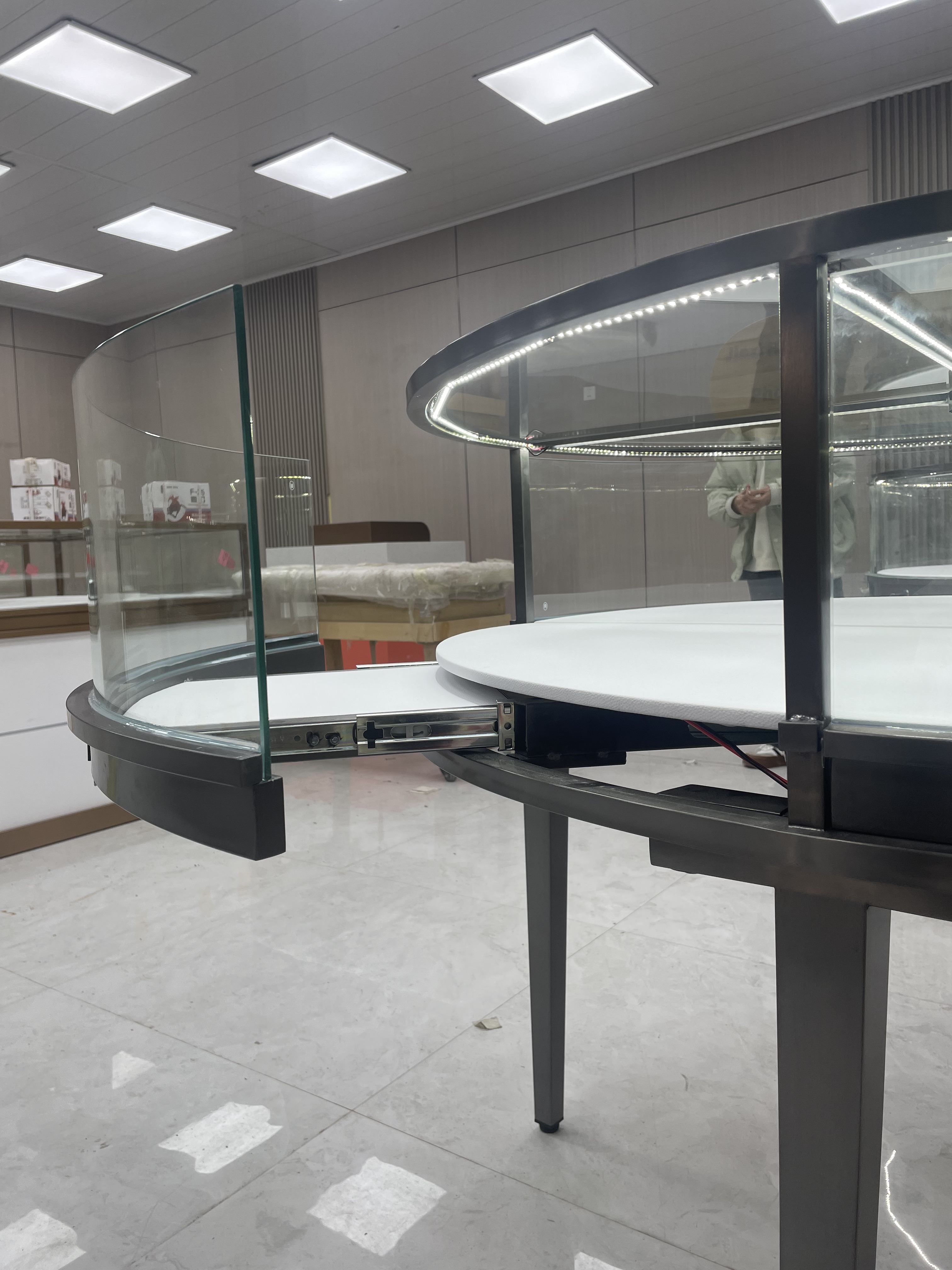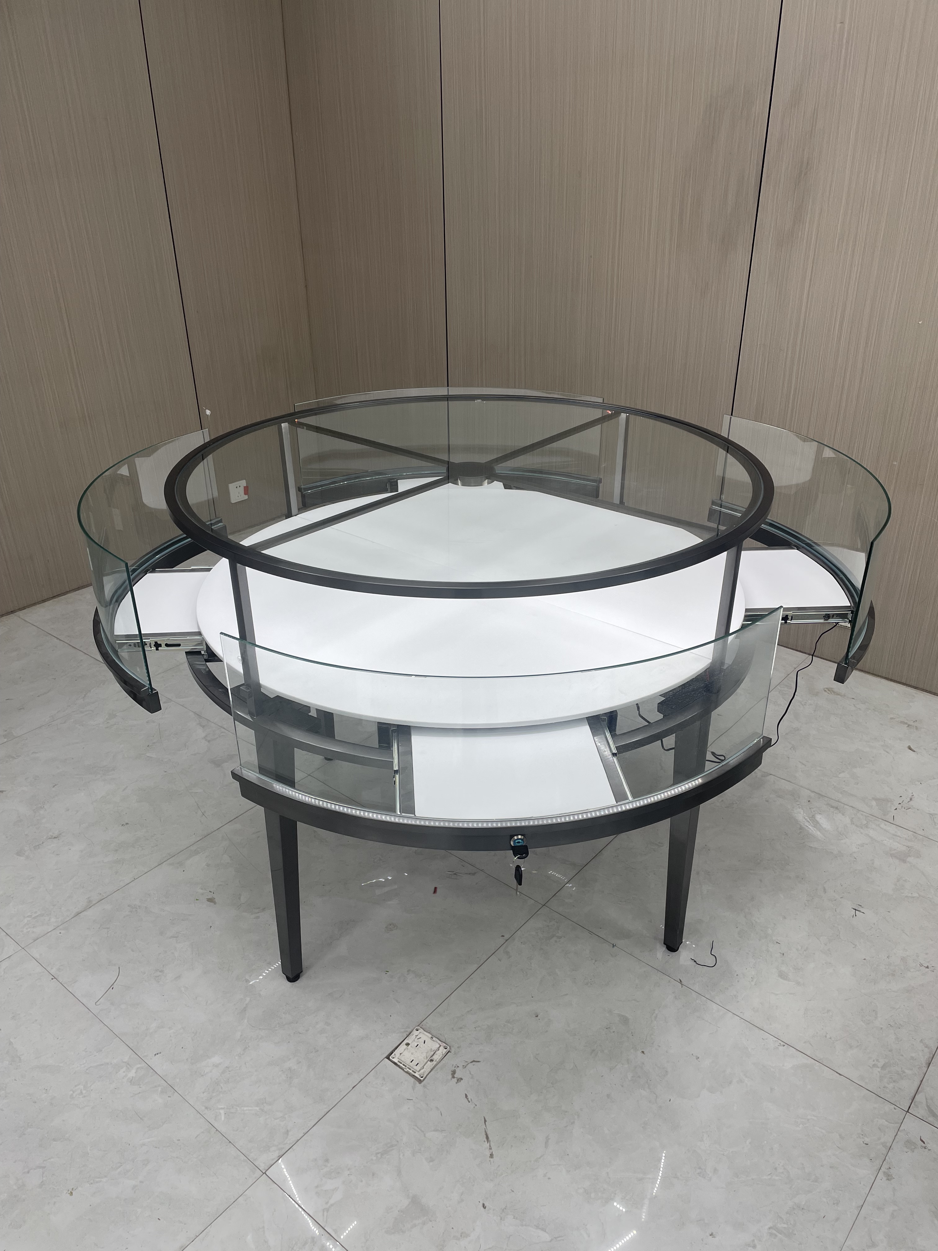 A: خزانة العرض مستديرة ، مع أبعاد من 120 سم × 120 سم × 95 سم ، مما يوفر مساحة واسعة للمجوهرات مع الحفاظ على مظهر أنيق ومدمج.