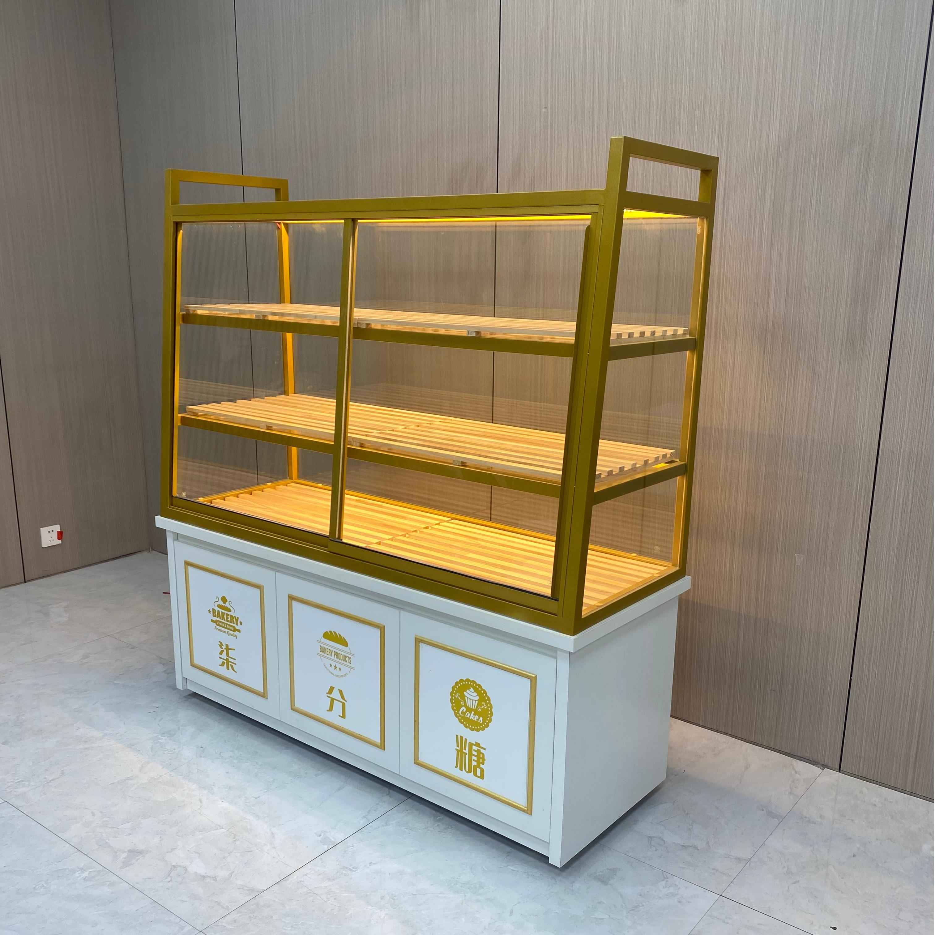 في الداخل ، هناك ثلاثة أرفف ، توفر مساحة كبيرة لتنظيم العديد من المنتجات المخبوزة. تتيح الأبواب الزجاجية المنزلق سهولة الوصول مع الحفاظ على شاشة واضحة. بالإضافة إلى ذلك ، توفر الخزانة الأساسية خيار الشعارات المخصصة المصنوعة ، وتمكين المخابز من العلامة التجارية عرضها وتعزيز هويتها البصرية.