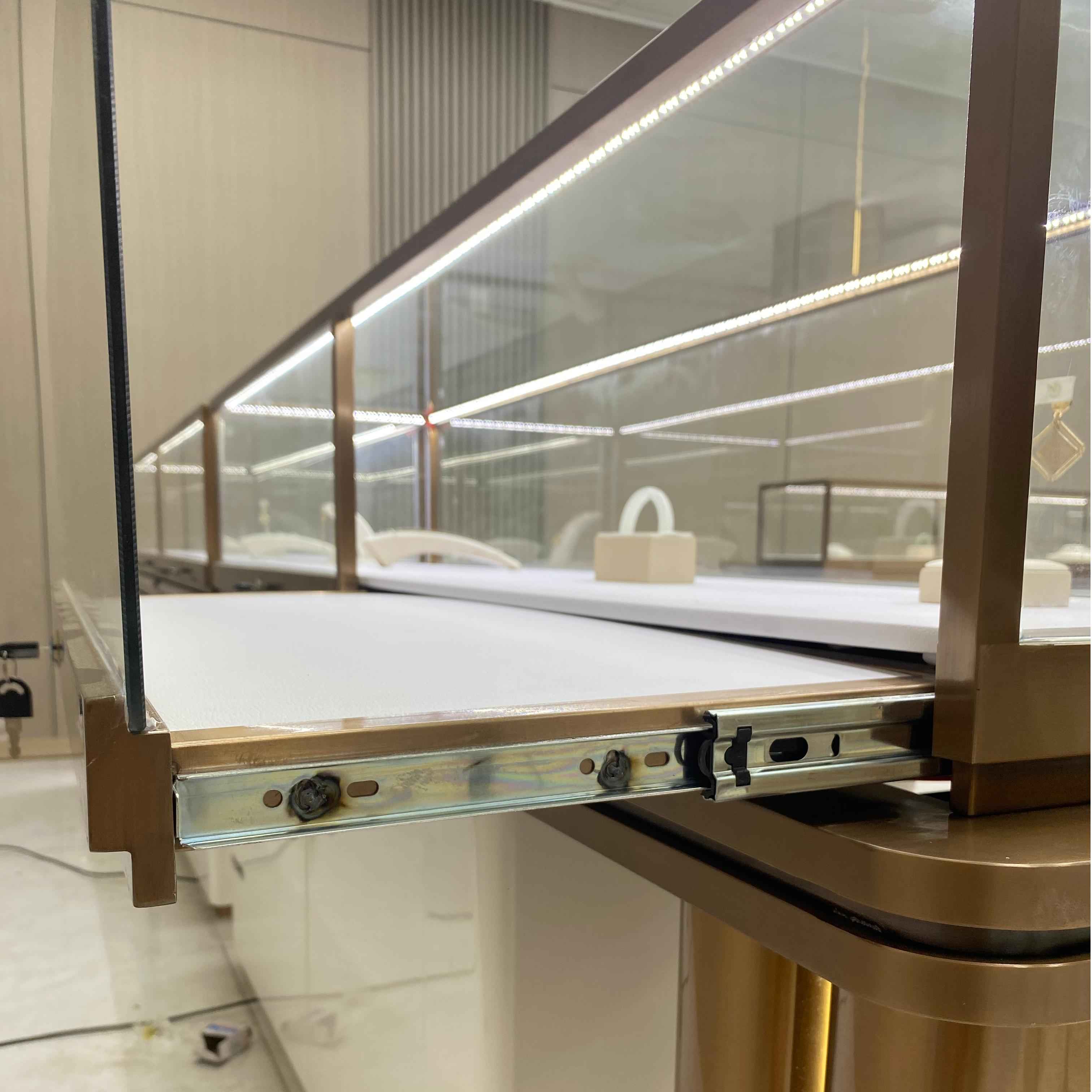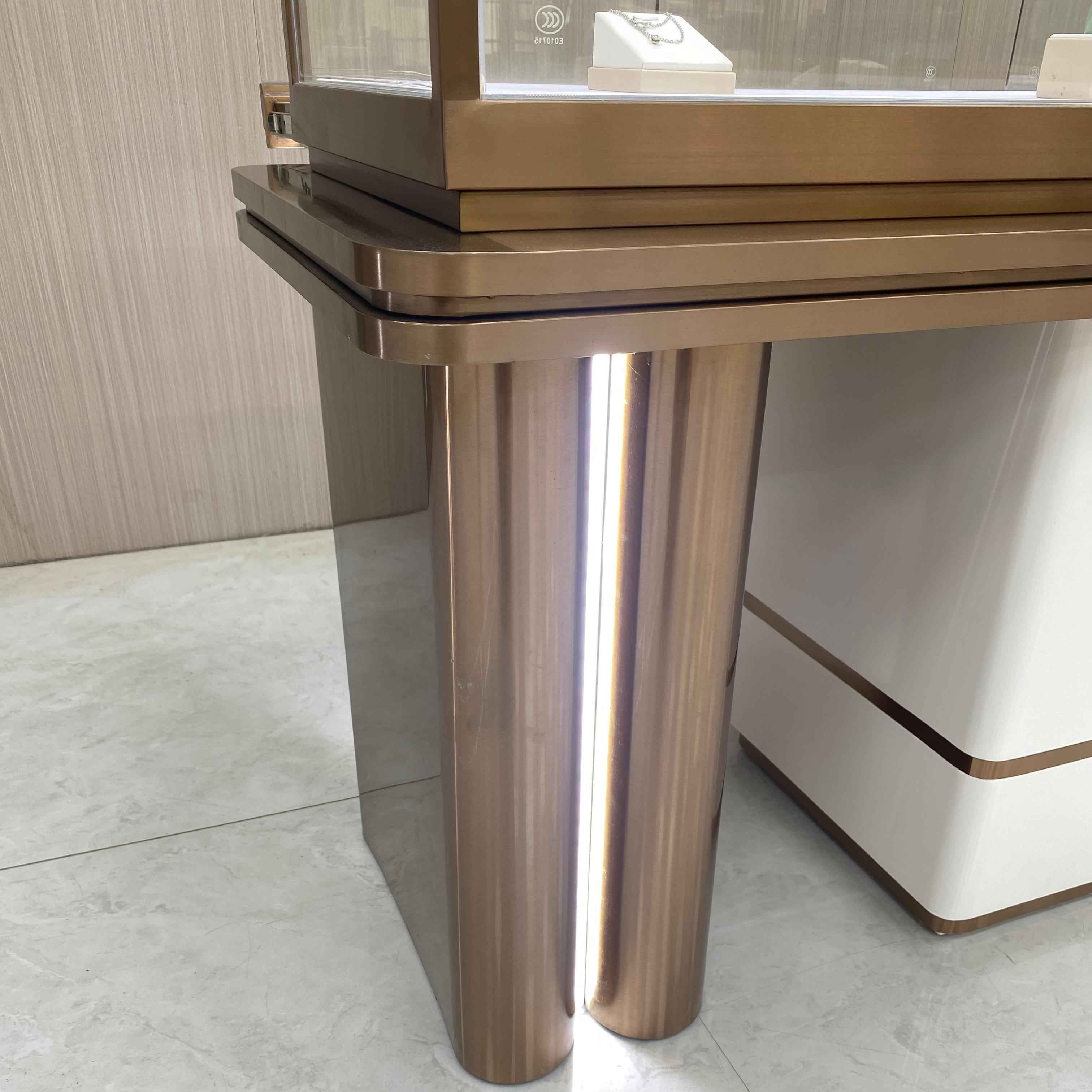 هذا هو خزانة عرض مجوهرات الإطار من الفولاذ المقاوم للصدأ. حجم هذه الخزانة هو L180*W60*H95CM.it يحتوي على إطار من الفولاذ المقاوم للصدأ الذهب الوردي مع لمسة نهائية. الخزانة مصنوعة من الزجاج المتقلب 8 ملم ، مع جلد بو الأبيض بطانة داخلية. الخزانة الأساسية بيضاء ، ويمكن إضافة شعارات مخصصة إليها.