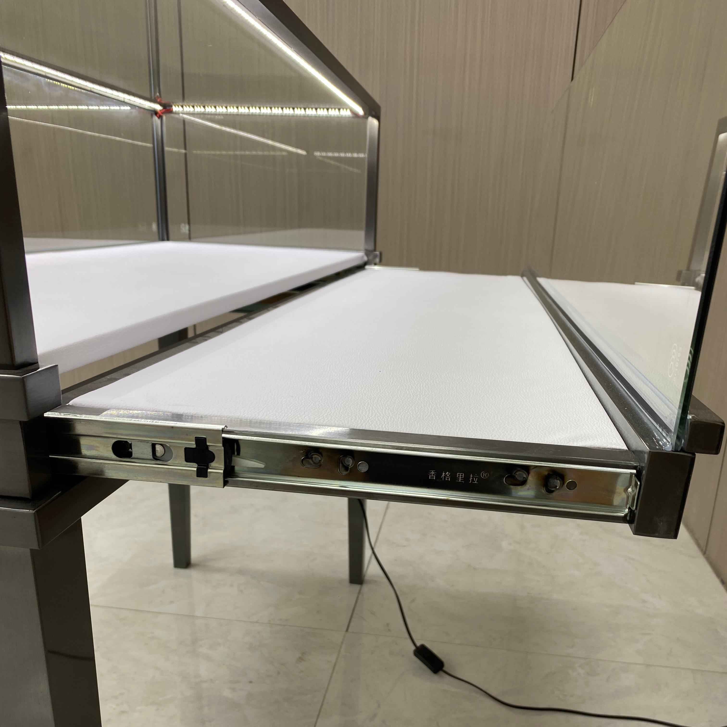 تعتبر خزانة عرض المجوهرات المصنوعة من الفولاذ المقاوم للصدأ مزيجًا مثاليًا من الموضة والتطبيق العملي. الحجم هو L120*W55*H95C.IT يتميز بانتهاء من الفولاذ المقاوم للصدأ من التيتانيوم مطلي باللون الأسود ، مقترنًا بزجاج مقلوب 8 ملم ، ويصطف الجزء الداخلي بجلد بوي أبيض ، ورفاهية. إنه مصمم خصيصًا للمبيعات التجارية وهو مناسب للسوق الفرنسي. إذا كنت تبحث عن خزانة عرض مجوهرات عالية الجودة ، فهذا هو خيارك المثالي.