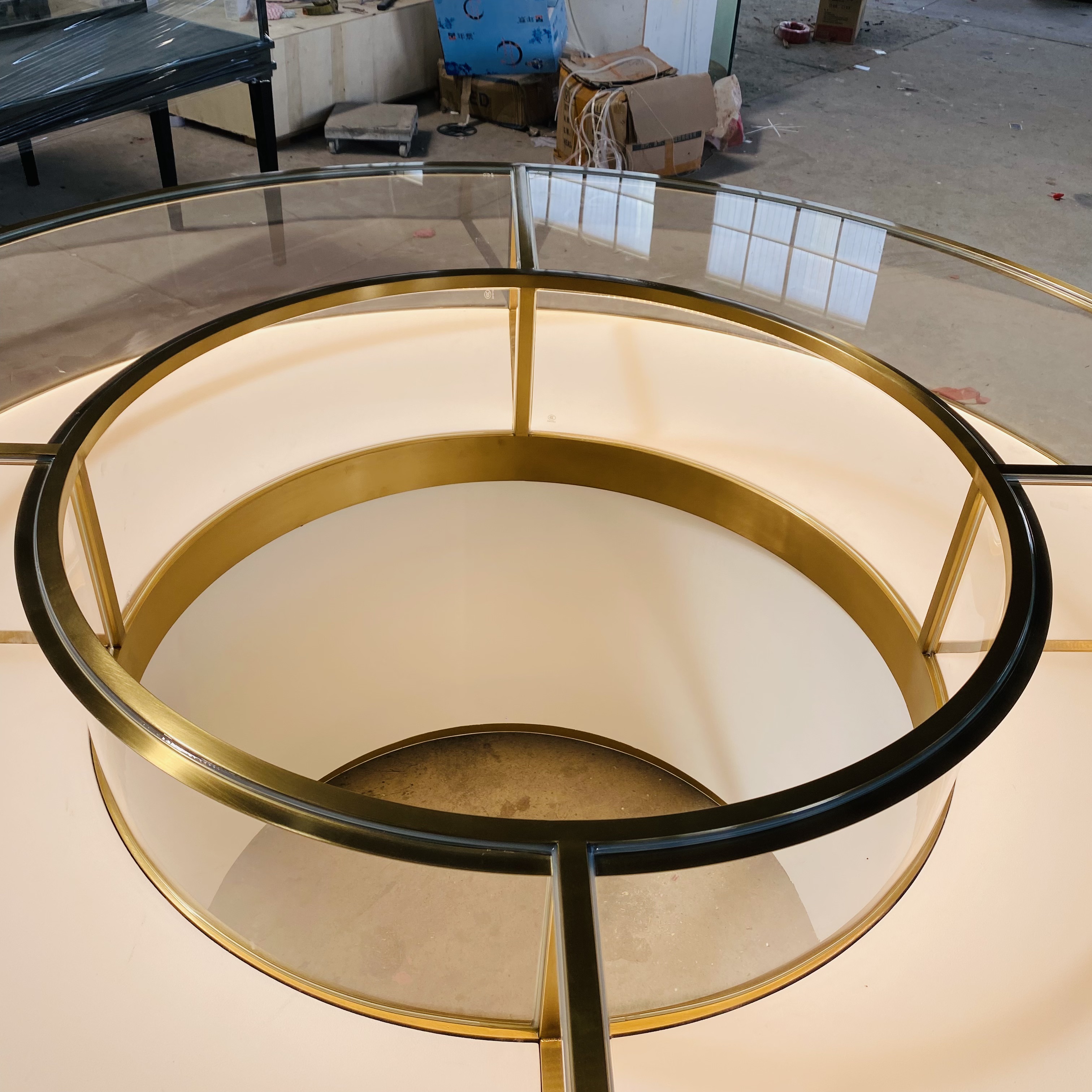 تتميز مجموعة مجوهرات المجوهرات على شكل مروحة بتصميم مميز للمروحة ، وتعرض قطع المجوهرات بأناقة. عادةً ما يتم بناؤها بإطار من الفولاذ المقاوم للصدأ أو الحديد المطاوع والزجاج المقسى ، فإنه يتميز بإضاءة LED مدمجة لتعزيز تأثير عرض المجوهرات. مناسبة لمحلات المجوهرات الراقية أو المتاحف ، فإنه يمثل الفخامة والذوق.